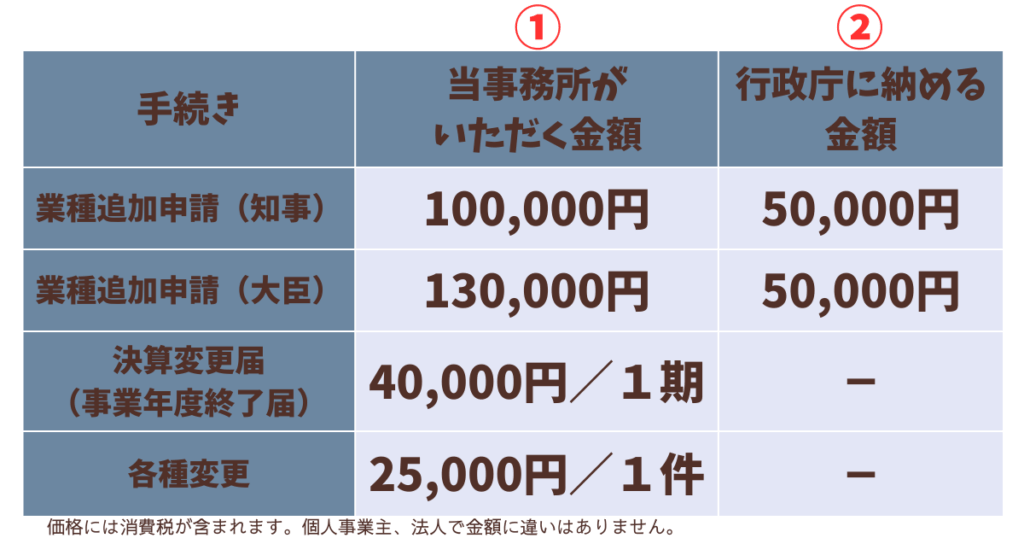 また、業種追加の手続きには、1回の申請につき、行政庁に支払う手数料が50,000円かかります。